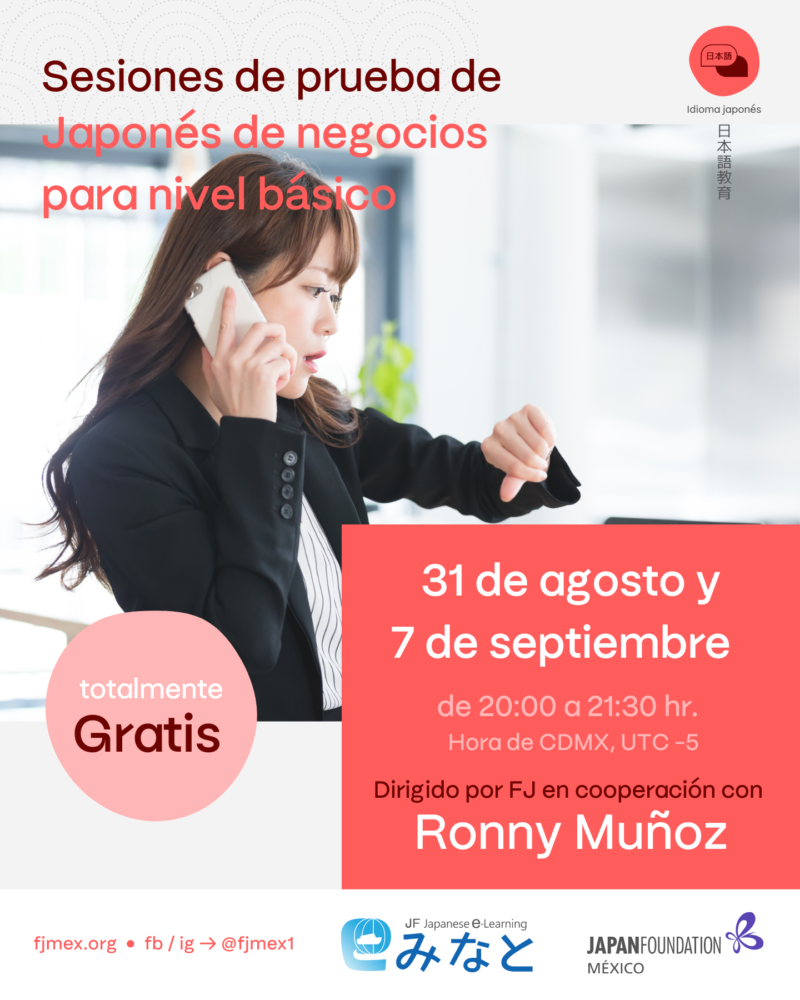 “Minato” es una plataforma para el aprendizaje del japonés administrada por Fundación Japón. Basta con que tengas acceso a Internet para que puedas inscribirte gratis y usarlo cuando quieras y donde quiera que estés. “Japonés de negocios desde el nivel básico A2 (Vol.2) Curso de Autoaprendizaje” es uno de los cursos disponibles en dicha plataforma y está dirigido a hispanohablantes que están trabajando actualmente en una empresa japonesa o que tengan interés en trabajar en una en el futuro. En este curso puedes aprender el japonés que se usa en ámbitos laborales, así como de la cultura empresarial japonesa. ¡Te invitamos a experimentar y aprenderlo con nosotros y otros participantes!